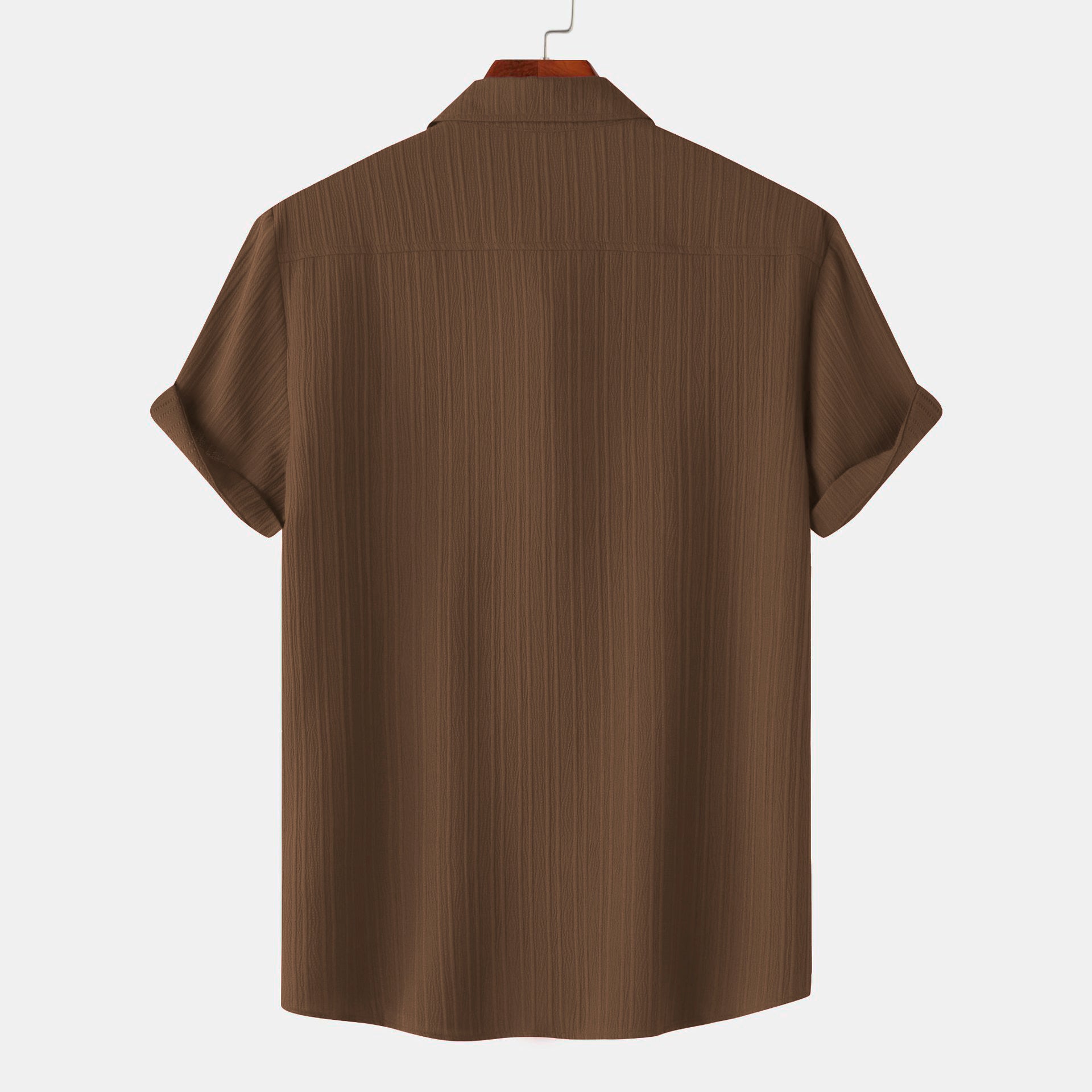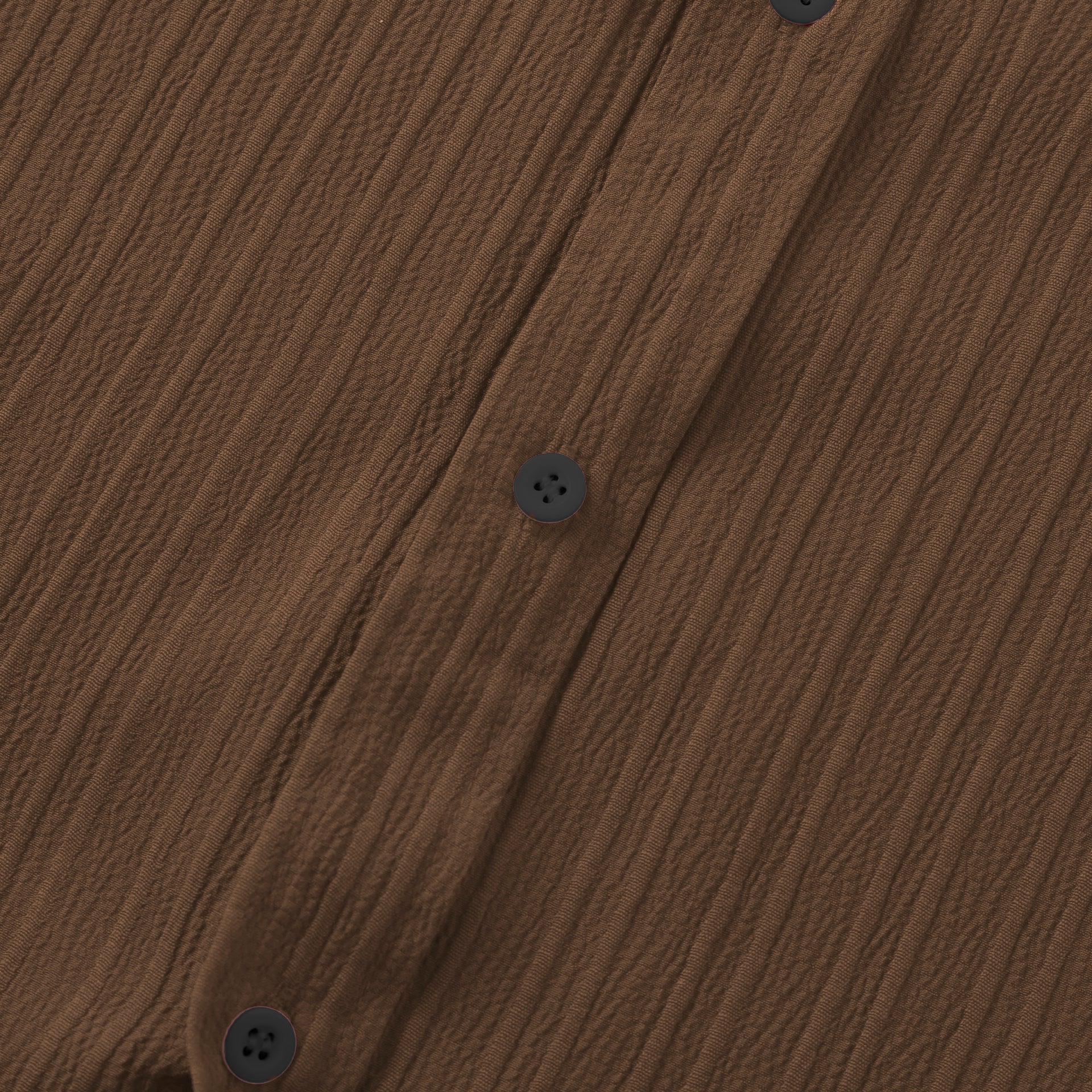 This brown color shirt features a sophisticated lining texture fabric with a structured fit. Designed for comfort and style, it's ideal for both office wear and smart casual outings.